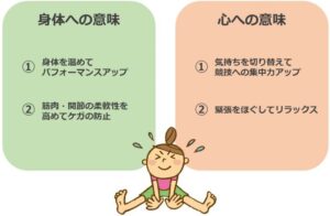 アップを行うことで、やる気をコントロールするホルモンであるアドレナリンが体内に多く分泌され、中枢神経を刺激して運動に対する心理的な準備が整います。