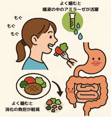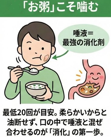 食べ物を歯で細かくかみ砕くと、唾液と混ざって適度に水分が増し、飲み込みやすくなるだけでなく、唾液には消化酵素のアミラーゼが含まれるため、体内での消化や吸収を促進するという重要な働きをします。噛めば噛むほど唾液の量が増えるので、よく噛んで唾液をたくさん出すことが大切です。つまり食べ物を良く噛むことによって、これらの消化酵素と御飯が混じりあい、消化が良くなるわけです。しかし、お粥はほとんど噛むことになしに食べることができます。消化酵素とお粥が混じりあうことがほとんど無いので、消化は良くないです。