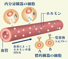 ホルモンは、体内に分泌され、さまざまな器官や組織をコントロールする物質の呼び名です。成長と成熟の調節、生殖機能の調節、エネルギーの貯蔵や消費の調節、ストレスに対する防御といった役割を持っていて、様々な臓器、組織から分泌されて、血流に乗って標的器官へ運ばれて生命機能を維持します。現在、ホルモンとして確認されているは100種類以上ありますが、さらに発見され続けています。どのホルモンもほんの少しの量で効果を発揮して、必要な時期に必要な量を作られることにより、からだのバランスは保たれています。