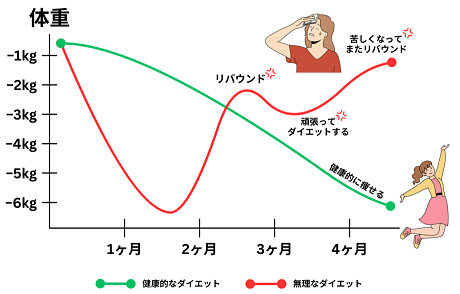 リバウンドを防ぐには、まず無理をせず、一ヶ月に今の体重の2%程度のペースで減量することです。例えば、体重60㎏の人なら、1.2㎏までの減量にすると身体は、飢餓状態にならずリバウンドし難いです。また、食事量を極端に減らさないで、朝食、昼食は、しっかり食べて、夕食を少なめに摂っていただくことも大事です。そして、栄養バランスを心がけ、夕食は午後7時までに済ませると尚良いです。体重の増加は、基本的に午後6時以降の食べる量、内容が大きく影響しますので、夕食が遅くなる時は極力食べるモノをカロリーの低いモノを選んで、少量にしていただくようにしてください。