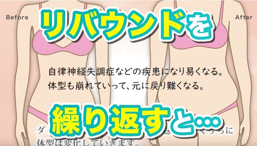 ダイエットを繰り返すことは、同じカロリーを摂っても代謝が落ちて、肥り易い体質になってしまいます。そして、痩せるという目標を達成できないだけでなく、肥った状態から回避できなくなって、色々な病気を招いたりします。また、極端な減量は、拒食症、過食症、自律神経失調症などの別の問題も起きるリスクが上がります。