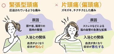 慢性の頭痛には、後頭部から肩にかけて重苦しい痛みがある筋緊張性頭痛と、ズキンズキンという痛みが特徴の片頭痛の2種類があります。そして、筋緊張性頭痛は、肩や首、頭まわりの筋肉の緊張が原因なので、38~40℃の湯に15分ほど入り、筋肉を和らげ、血流をよくすることで痛みが改善します。しかし、片頭痛は、頭の中の血