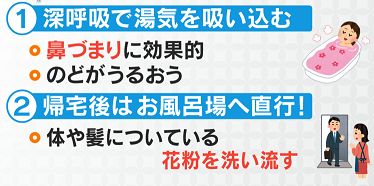 花粉症には、体や髪についた花粉を洗い流すためにも毎日入浴が有効です。鼻づまりの症状は、鼻の奥の粘膜の下の毛細血管に血がたまり腫れているのが原因なので、入浴で血流をよくすると一時的ですが鼻づまりは解消します。また、お風呂で湯気を吸うと、花粉やアレルギー物質が洗い流されるようです。