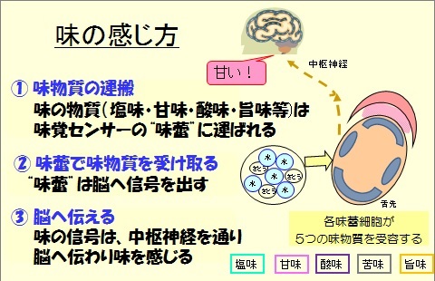 味は、口に入った後、味蕾という舌や軟口蓋などにある味細胞が、唾液に溶けた味の物質を刺激として受け取りこの刺激が味覚神経を通って脳に伝達され、色々な味として認識されます。