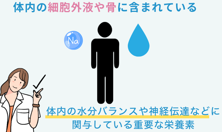 ナトリウムの主な働きは、カリウムとともに体内の水分バランスや細胞外液の浸透圧を維持しているほか、酸・塩基平衡、筋肉の収縮、神経の情報伝達、栄養素の吸収・輸送などにも関与しています。また、水分を保持しながら細胞外液量や循環血液の量を維持し、血圧を調節しています。
