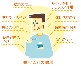 また、厚労省研究班は65歳以上の高齢者4425人を4年間にわたって追跡調査した結果、歯を失って噛めなくなった人は、認知症のリスクが約2倍も高くなることや、残っている歯が少ないほど記憶や運動などの能力が低下する傾向にあることも報告しています。つまり、噛む力を維持すれば、認知症予防や運動機能低下も防げることになるということです。