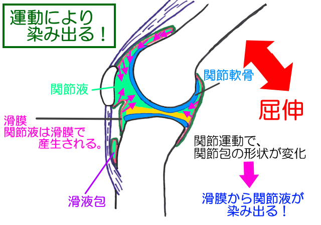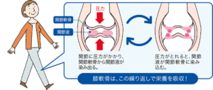 滑液は、関節の保護・維持などの潤滑の役目と関節軟骨への栄養補給の役目があります。栄養を届ける滑液が関節軟骨組織内の軟骨細胞にまで浸み込むためには、使う・運動するといった関節の動きが必要です。動かすことで滑液が分泌され、吸収され代謝します。世の中でよく耳にする“軟骨がすり減る”状態でも、動かすことで修復スピードが間に合っていれば不具合は起きませんし、もちろん痛みもでません。