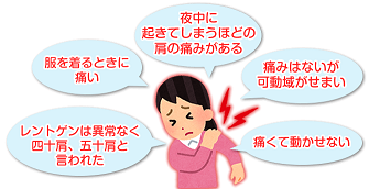 当方の利用者の方にも、四十肩や五十肩という様に腕が真横より上に上がらなくなってしまったり、上げると痛いという状態になっていた方はすごく多く、当方にお越しになるまでは苦労されていたようです。整体等で肩周りをほぐして一時的には可動域の改善や痛みの軽減はしますが、長く効果が持続し難いというのもその方々の共通の特徴でした。