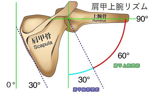 ここからが本題ですが、人の身体の構造は腕を上げる際に肩甲骨も連動して動くのが正常な動きとなっています。この肩甲骨と腕(上腕骨)が連動して動く仕組みを「肩甲上腕リズム」と言います。腕の付け根、土台は肩甲骨が担っていると思っていただくと良いかと思います。