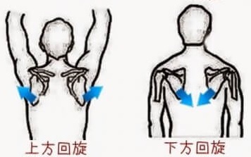 肩甲骨の下角(肩甲骨の下の出っ張り)が、反時計回りで上がっていくのを「上方回旋」、時計周りで下がるのを「下方回旋」と言い、それぞれ腕を上げる時と下げる時で活躍してくれます。(先程の肩甲上腕リズム)