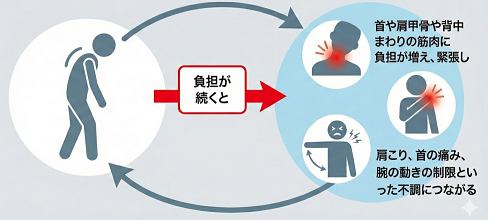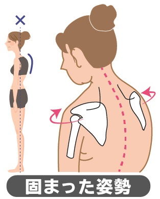 しかし、円背や反り腰等の姿勢不良によってこの回旋運動は制限されてしまいます。回旋運動が制限される事により結果的に肩の痛みや可動域の制限に繋がります。