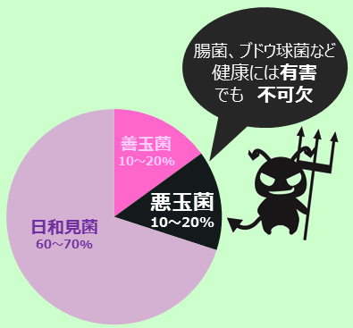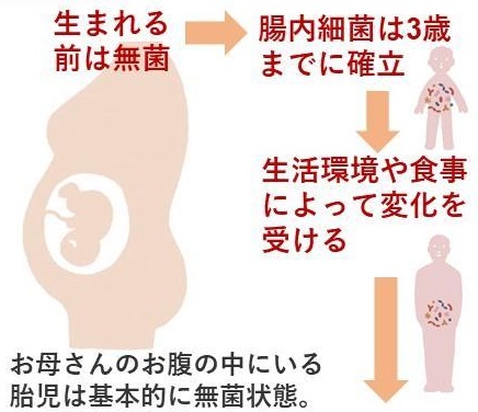 腸内細菌の形成パターンは、一人ひとり異なります。食生活や生活環境も関係しますが、一番大きな影響を与えるのは母親の腸内環境だと言われています。生まれてくるときに、母親の産道にある腸内細菌に接触することで細菌をもらい受けて、赤ちゃんの腸内に入り込み、腸内細菌として増殖していき、3歳までに腸内フローラの原型が作られると言われています。善玉菌は、糖分や食物繊維を食べて発酵させ、乳酸や酢酸などを作り出し、腸内を弱酸性に保ちます。腸内が酸性に傾くと、悪玉菌は増殖ができなくなり、毒性物質が作られなくなります。また、外から入ってくる悪玉菌のほとんどはアルカリ性の環境を好むため、仮に腸内に入って来たとしても、酸性の環境を維持していれば、悪玉菌の作用は抑えられます。悪玉菌には悪いイメージがありますが、肉類などのタンパク質を分解して、便として処理排泄するという我々にとっては、不可欠な存在です。