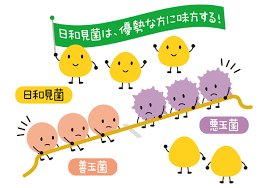 日和見菌は腸内細菌の7割を占め、善玉菌が優勢な状態であれば善玉菌につき、腸内で発酵活動を行います。しかし、腸内で悪玉菌が優勢となれば、悪玉菌になびいてしまい、腐敗活動を行います。腸内を酸性に維持するためには、腸内環境をコントロールして、日和見菌を善玉菌の味方につける事が必要です。このやり取りは出生時から始まり、離乳期、青年期、老年期と、経年的にその様相は変化していますが、年齢に関係なく腸内フローラのバランスが崩れてしまうこともあります。その理由の一つとして高脂肪の食生活があげられています。腸内環境は食べたものに大きく左右されるため、腸内フローラを良いバランスで維持するためには、栄養バランスのとれた食事が大切です。また、食事だけではなく、適度な運動は腸内フローラが活性化すると言われていますので、習慣として取り組んでくださいね。。