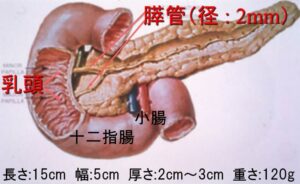 更に、膵臓内部には膵尾部から膵体部・膵頭部を経て十二指腸へと膵液を流す径2mm~3mmの主膵管が走っています。また、膵頭部には肝臓で作られた胆汁を十二指腸に流す径7mm~8mmの総胆管が通り抜けています。これらの主膵管と総胆管は十二指腸につながる直前で合流し、十二指腸に開口する部分は乳首の先のようになっており「十二指腸乳頭」と云います。