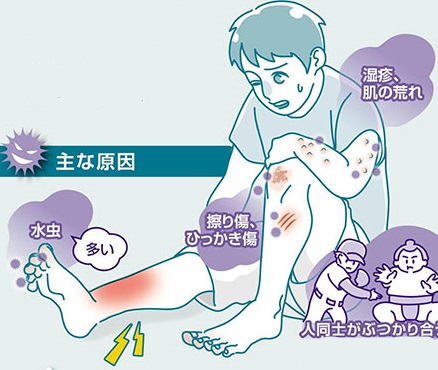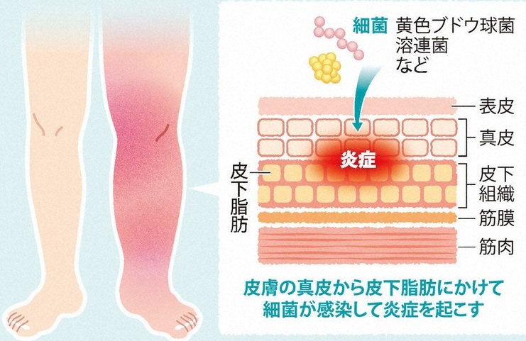 以前、高齢者施設で足の皮膚が赤く腫れてるのをよく見かけましたが、何かばい菌入って腫れてるのかなと思ってましたが、それこそ蜂窩織炎でした。原因となる菌は、ブドウ球菌や溶血性連鎖球菌(溶連菌)などです。連鎖球菌は、感染範囲を抑えようとする組織の働きを妨げる酵素を作り出し急速に広がります。また、ブドウ球菌は覆われていない傷口や皮膚膿瘍(膿がたまった空洞)の周りに生じます。感染が広がってしまうと感染部位に近いリンパ節が腫れて、リンパ管が炎症を起こすこともあります。明らかな傷がない場合でも起こることがありますので、適度な運動を習慣にして免疫力を落さないようにしてくださいね。