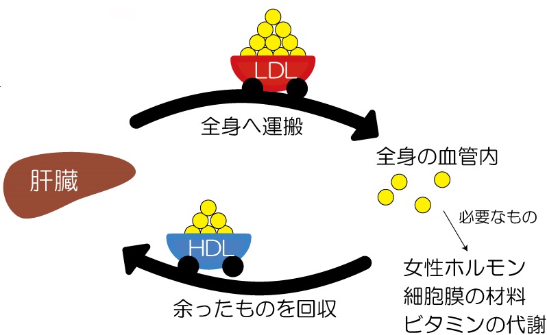 コレステロールは、全身の細胞膜の成分、ホルモンやビタミンDの材料、胆汁酸の原料にもなり、食事によって入ってきた脂質やビタミンの吸収にも働きます。