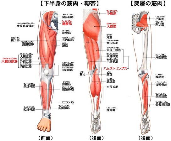 関わっている筋肉は、大腿骨の前面には主に膝を伸ばす大腿四頭筋、後面は膝を曲げるハムストリングス、内側にある内転筋群、外側には中小殿筋、大腿筋膜張筋などがあります。表面から見ると関係の無いように見えますが、膝窩筋や足底筋、腓腹筋などは膝から下にある筋肉ですが大腿骨の後面から脛骨やアキレス腱を介して踵の骨まで繋がっており、膝関節を曲げるなどの役割にも参加しています。他にも腸腰筋や臀筋群の筋肉も大腿骨に付いていて股関節を跨いで股関節を屈曲する、また脚を外転・外旋する役割に関わっています。筋肉の名称だけを聞くと数種類ですが、大腿四頭筋は、大腿直筋、内側広筋、中間広筋、外側広筋といった筋肉の総称のようにそれぞれの筋肉を数えていくとかなり多くの筋肉になります。