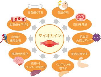 例えば、ケガによって筋肉が損傷した場合、筋組織の炎症症状が現れ、筋組織回復に重要な働きをすることは知られています。そして、運動による筋の微細損傷においても同様のことが起こることを検討した結果、筋中の再生サイクルにおいて成長因子を多く分泌するという特性は、全身性の健康にも大いに作用するようです。また、定期的な運動習慣においても身体にいろいろな良い効果をもたらす可能性か強く、まだたくさん新しい識見が出てくる可能性があるようです。