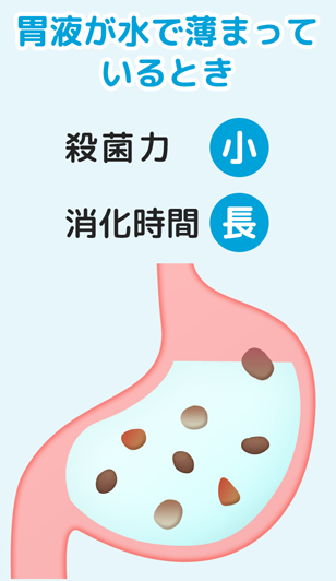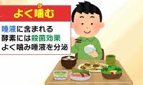 咀嚼とは違いますが食事の時の水分補給にも気をつけてください。胃液は強酸性と書きましたが、食事の時の水分摂取量が多いとこの酸性度が低くなり弱くなってしまいます。また、胃薬の飲用で胃液の分泌が減ると細菌が死滅しないと考えられています。