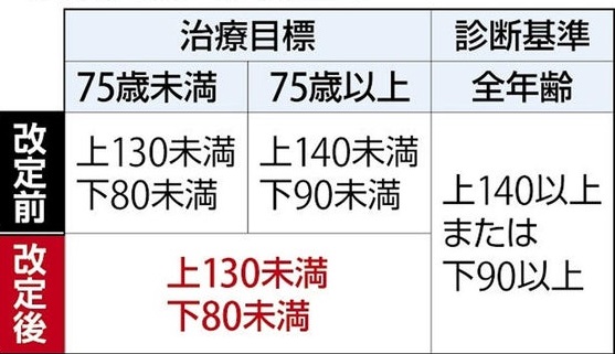 今年8月に6年ぶりに高血圧管理治療ガイドラインが見直されました。これまで後期高齢者では140/90とされていましたが、全ての人共通の目標血圧を130/80 mmHg未満と設定しています。基準を超えた場合、降圧剤、利尿薬やβ遮断薬が初期治療薬として服用、降圧効果が不十分な場合には、早期に他の薬物との併用を行うことが推奨されています。
